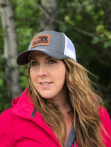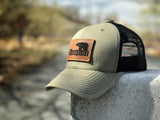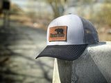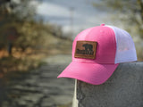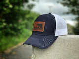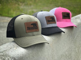 We offer this hat in navy blue, and have recently added olive green, stone gray with a black bill and pink! It features a custom leather patch front and center with our classic bear logo. This hat is great for both adults and youth alike.