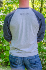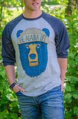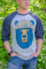 This men's (unisex) 3/4 length sleeved baseball jersey, comes in a heathered gray body and heathered blue sleeves. This super soft jersey knit shirt, boasts a large bear print on the front as well as our 'Live The Life' tagline on the upper back.