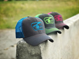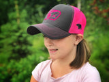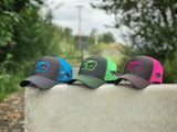 This new cap sports a large wool patch with a reel and fly design on the front, and your favorite bear logo on the side. The front panels of the hat are made of a gray fabric and the mesh on the back will match the stitching on the front. This hat is available in 3 neon colors.
